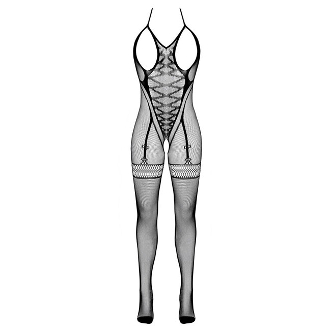 Črni odprti kombinezon znamke Fantasy by Cottelli je brez mednožja in izdelan iz nežne mreže.