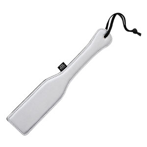 Dvojno oblazinjen lopar iz umetnega usnja vam omogoča različne užitke. Eleganten loparček je specifično oblazinjen na vsaki strani. Na eni strani je lopar oblazinjen nežno, s srebrno, satenu podobno površino, ki bo poživila cirkulacijo. Medtem pa je na drugi strani čvrsta in napeta površina v črni barvi, namenjena konkretnemu "šeškanju". Lopar za šeškanje je primeren za igranje vlog, kjer se dominanca zlahka združi s seksi zapeljevanjem in uživanjem. Lopar je udoben za držanje in ima pri ročaju vrvico, katero si lahko ovijete okoli zapestja, da vam ne zdrsne iz rok. Srebrna stran loparja je namenjena nežnemu, čutnemu šeškanju, medtem, ko je črna stran namenjena konkretnim, odmevnim udarcem. Knjižna uspešnica Petdeset odtenkov sive je izdala 20 erotičnih pripomočkov in vsi so uradno odobreni s strani avtorice E. L. James. Eden izmed njih je tudi ta lopar za šeškanje. K izdelku je priložena še elegantna vrečka za shranjevanje. Idealno kot darilo! Barva: siva / črna Dolžina: 32 cm Material: saten, umetno usnje