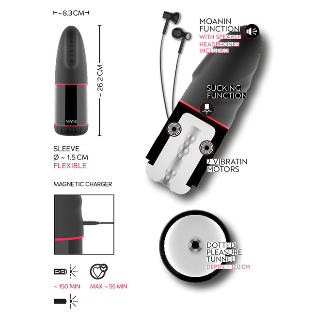 Dvomotorni masturbator 02 proizvajalca WYNE zagotavlja intenzivne užitke na penisu s svojimi 10 načini vibriranja in 3 načini sesanja.
